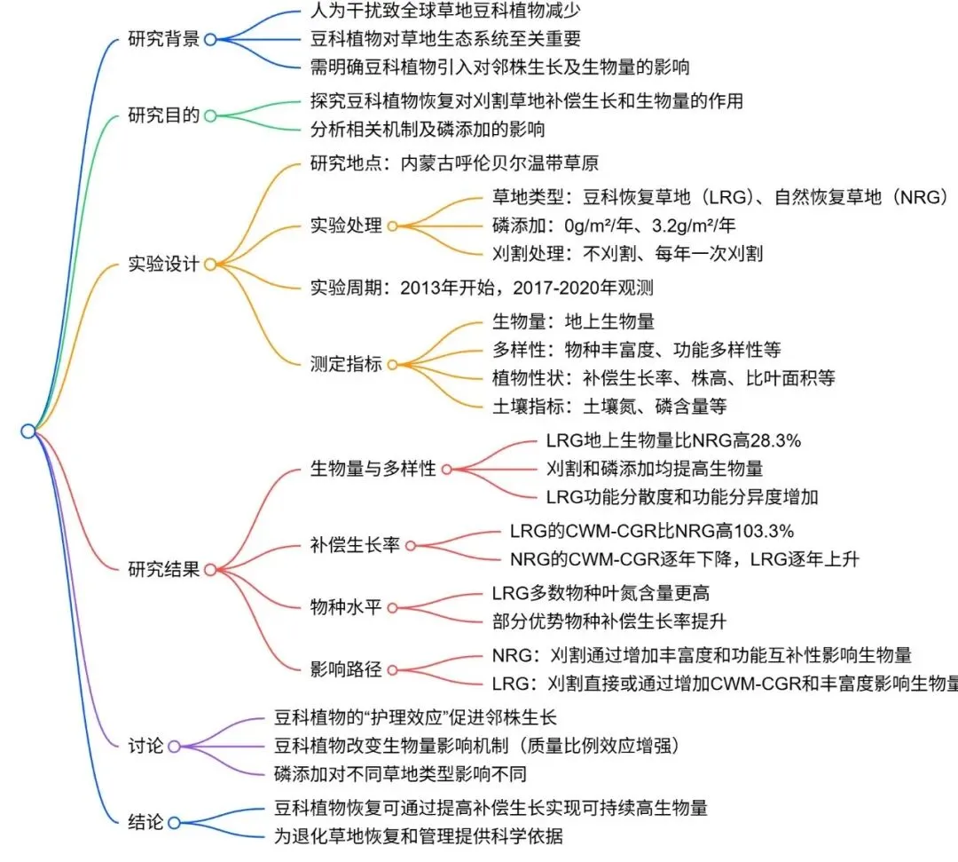 结构方程模型(SEM)分析揭示了不同恢复类型下生物量调控机制的差异,模型分别解释了LRG和NRG中87%和80%的地上生物量变异。在NRG中,生物量与物种丰富度(标准化效应值:0.29)、优势度(标准化效应值:0.35)和功能离散度(FDis)(标准化效应值:0.24)均表现出显著的正相关关系。然而,在LRG中,生物量则与CWM-CGR(标准化效应值:0.25)和物种丰富度(标准化效应值:0.18)显著正相关。这表明,在NRG中,生物量主要由群落结构和功能互补性驱动;而在LRG中,以补偿性生长为代表的优势物种功能性状(即质量比效应)变得至关重要。处理措施的影响路径也因此不同:在NRG中,刈割通过增加丰富度来提升生物量,或通过降低优势度来减少生物量,而施磷则直接促进生物量;在LRG中,刈割可以直接增加生物量,也可以通过提升丰富度和CWM-CGR间接增加生物量,而施磷则不直接影响生物量,而是通过提升丰富度和CWM-CGR间接发挥作用 (Fig. 5)。