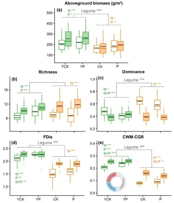 图2. 豆科植物恢复结合刈割(M)和施磷(P)对地上生物量(a)、物种丰富度(b)、优势度(Berger-Parker指数)(c)、功能离散度(FDis)(d)和群落加权平均补偿性生长率(CWM-CGR)(e)的影响。橙色和绿色分别代表豆科植物恢复和自然恢复的草地。空心箱体表示不刈割,实心箱体表示刈割。e中的饼图展示了基于平方和分解分析,由豆科植物引入引起的促进作用(种内性状变异)与物种周转(种间性状变异)在解释CWM-CGR变异中的相对重要性。x轴标签中的“Y”表示使用黄花苜蓿(Medicago falcata L.)补播的豆科植物恢复草地,CK表示对照。箱体的两端是上(75%)和下(25%)四分位数;箱内横线是中位数;上下须线代表中间50%以外的响应值。箱内黑色横线是平均值。星号表示显著性差异:p < 0.05, ** p < 0.01, *** p < 0.001。