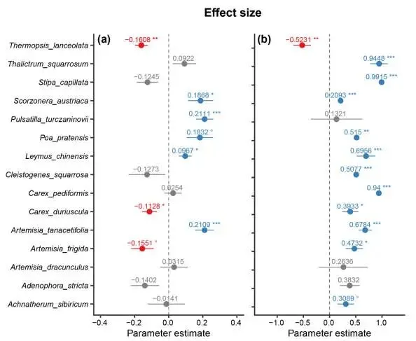 图4. 豆科植物恢复对15个常见物种补偿性生长率(a)和叶氮含量(b)的影响。效应大小表示为线性混合效应模型的标准化固定效应值。效应值以参数估计值±标准误表示。蓝色表示显著正效应,红色表示显著负效应,灰色表示无显著效应。星号(*)表示LRG与NRG之间的显著性差异:° p < 0.1, * p < 0.05, ** p < 0.01, *** p < 0.001。