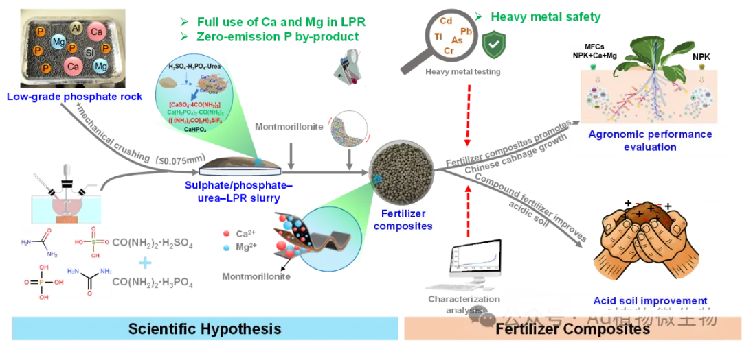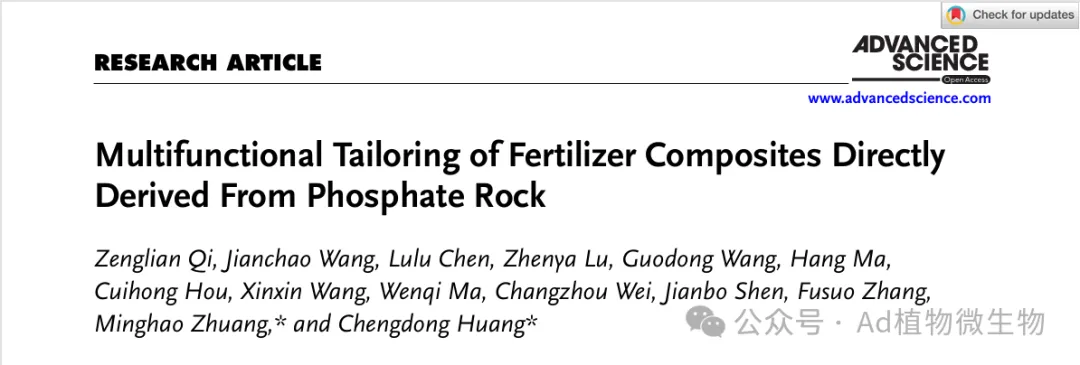 近日,中国农业大学张福锁院士团队黄成东课题组联合国内多所高校与肥料企业,在国际权威期刊Advanced Science上发表了一项重要研究成果,题为"Multifunctional Tailoring of Fertilizer Composites Directly Derived From Phosphate Rock"的研究论文。该研究成功突破了以磷矿为原料直接绿色合成智能肥料的关键技术瓶颈,为我国磷资源的高效、清洁和高值化利用开辟了全新路径。