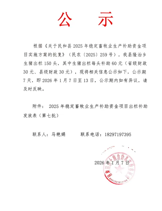 根据《关于民和县2025年稳定畜牧业生产补助资金项目实施方案的批复》(民农〔2025〕259号),我县隆治乡生猪出栏150头,其中生猪出栏每头补助60元(省级财政30元、县级财政30元),现将相关信息公示如下,公示期7天,即2026年1月7日至13日,公示期内如有异议,请及时反映。