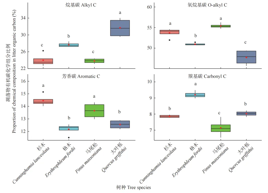 4个树种的凋落物和细根样品的有机碳化学组分均存在显著差异(P<0.05)。凋落物中,烷基碳比例表现为大叶栎>格木>马尾松>杉木;氧烷基碳比例表现为马尾松>杉木>格木>大叶栎;芳香碳比例表现为杉木>马尾松>大叶栎>格木;羰基碳比例表现为格木>大叶栎>杉木>马尾松。其中,大叶栎和格木的烷基碳、羰基碳比例显著高于马尾松和杉木,芳香碳、氧烷基碳比例显著低于马尾松和杉木(P<0.05)。