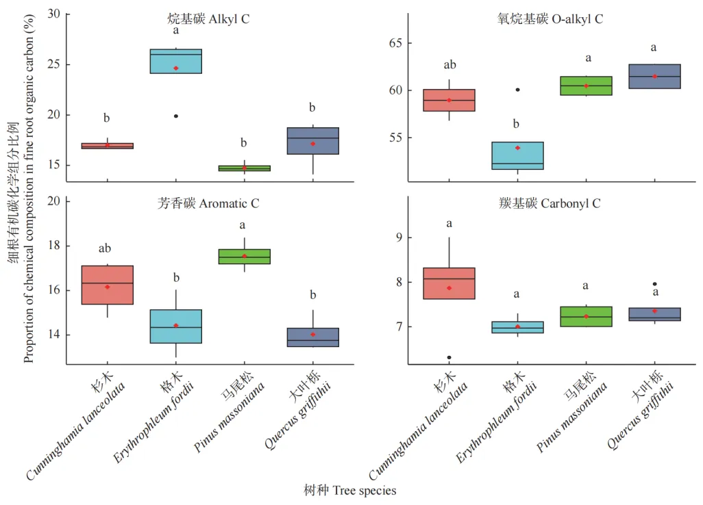 细根中,烷基碳比例表现为格木>大叶栎>杉木>马尾松;氧烷基碳比例表现为大叶栎>马尾松>杉木>格木;芳香碳比例表现为马尾松>杉木>格木>大叶栎;羰基碳比例表现为杉木>大叶栎>马尾松>格木。其中,格木烷基碳比例显著高于其他树种,马尾松芳香碳比例显著高于格木和大叶栎,格木氧烷基碳比例显著低于大叶栎和马尾松(P<0.05);羰基碳比例在4个树种中无显著差异(P>0.05)。