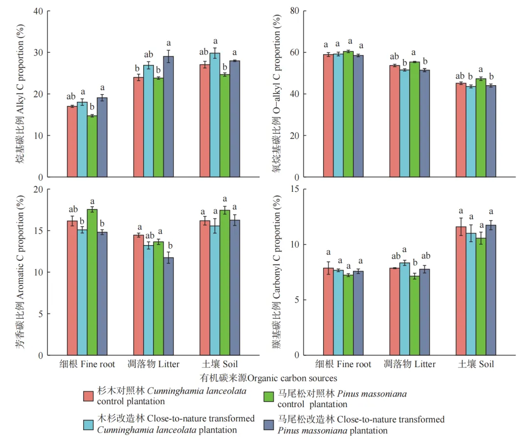 马尾松改造林显著提高了凋落物、细根和土壤中烷基碳的比例,显著降低了凋落物和土壤中氧烷基碳的比例,以及细根和凋落物中芳香碳的比例(P<0.05)。然而,近自然化改造对杉木凋落物、细根和土壤中的各有机碳化学组分没有显著影响。