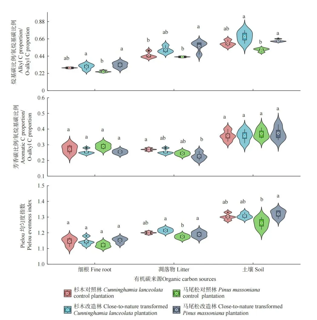 马尾松改造林的土壤、凋落物和细根的烷基碳比例/氧烷基碳比例比值显著高于马尾松对照林(P<0.05);此外,马尾松改造林的凋落物和土壤Pielou均匀度指数也显著高于马尾松对照林。