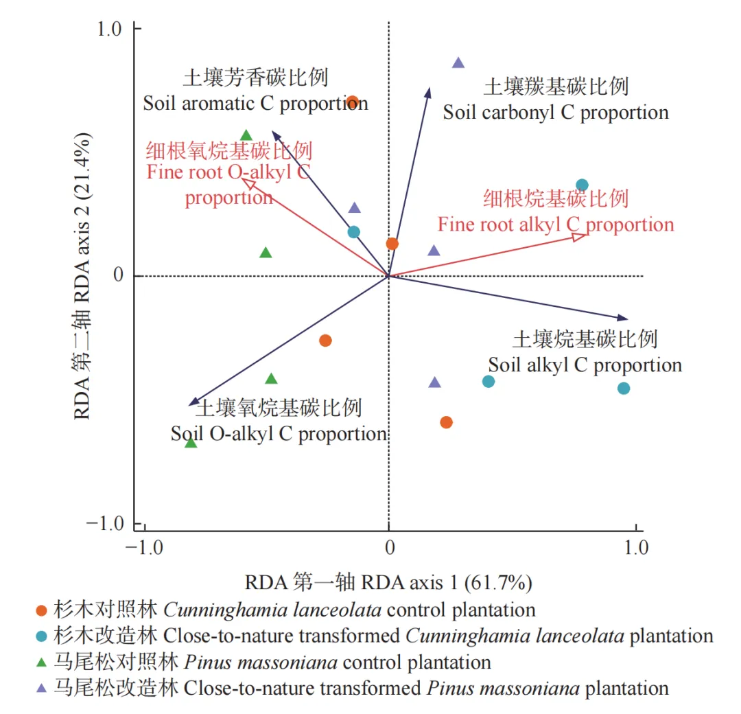 RDA分析结果表明,第一轴共解释了61.7%的变异,第二轴解释了21.4%的变异;置换检验表明,土壤有机碳组分与细根烷基碳比例(F=9.2,P=0.002)、细根氧烷基碳比例(F=2.9,P=0.036)显著相关。其中,细根烷基碳比例与土壤羰基碳比例显著正相关,细根氧烷基碳比例与土壤芳香碳比例显著正相关。