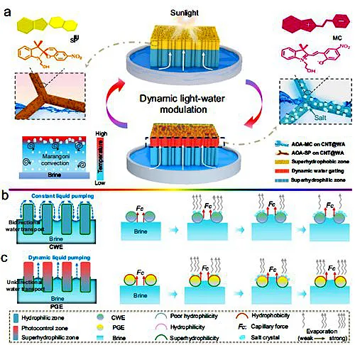 淡水短缺是一个严重的全球问题,水污染加剧了这一问题。太阳能驱动界面蒸发(SDIE)由于其能源效率和环境效益提供了一个很有前途的解决方案。本研究提出了一种动态光驱动自适应界面太阳能蒸发系统。该系统解决了平衡高蒸发速率和盐积累的挑战,这是SDIE技术的一个常见限制。蒸发器的开发使用改性螺吡喃和廉价的木材,使动态盐排放通过光的变化。理论计算表明,螺旋体的可逆结构变化有利于脱盐。蒸发器采用两层设计,上层为光控层,下层为亲水性层,通过稳定气液界面,最大限度地减少热损失来促进蒸发。实验结果证实,蒸发器具有长期稳定的盐排放和淡水生产能力,具有较高的蒸发速率、可重复使用性和抗污染性。室外实验和水质净化试验进一步验证了其产淡水和防盐的有效性。这项研究强调了光响应材料在设计高效、可持续蒸发器方面的潜力,为水净化和海水淡化技术提供了重大突破。