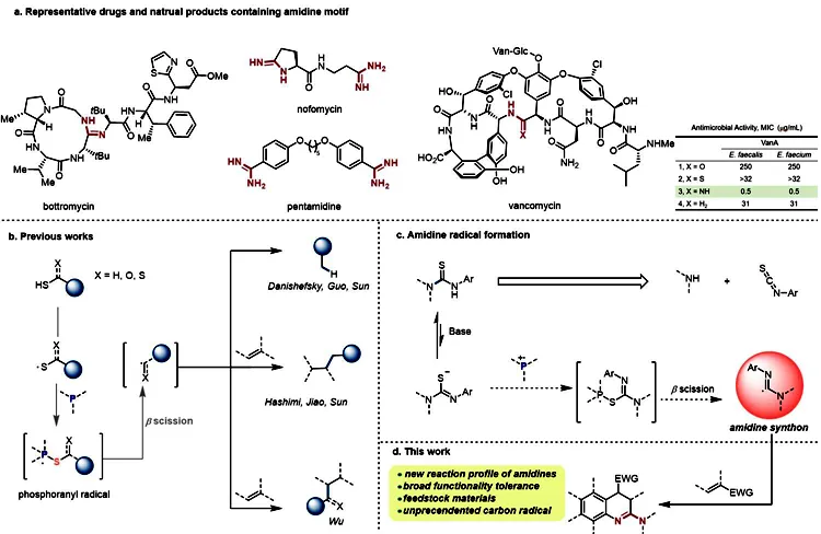 近日,我校化学工程学院蔡灵超教授课题组在国际知名期刊《Nature Communications》在线发表了题为“Photocatalytic Generation of Amidine Carbon Radicals for Aminodihydroquinoline Synthesis ”的研究论文(原文链接:https://www.nature.com/articles/s41467-025-66701-z)。我校为第一完成单位, 化工院硕士研究生姚鑫为第一作者、张葵副教授和蔡灵超教授为通讯作者。