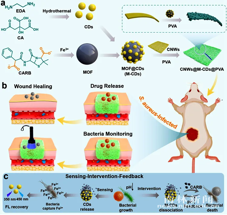 近日,林产化学与材料国际创新高地木质纤维素功能材料团队在国际材料领域知名期刊《Advanced Functional Materials》(影响因子19.0)在线发表了题为“Closed‐Loop Responsive Smart Bandages for Dynamic Monitoring and Self‐Regulated Antibacterial Therapy in Wound Healing”的研究论文(论文链接:https://doi.org/10.1002/adfm.202520327)。我校为第一完成单位,喻照川博士为论文第一作者。该研究工作得到了国家自然科学基金、江苏省自然科学基金等项目的资助。