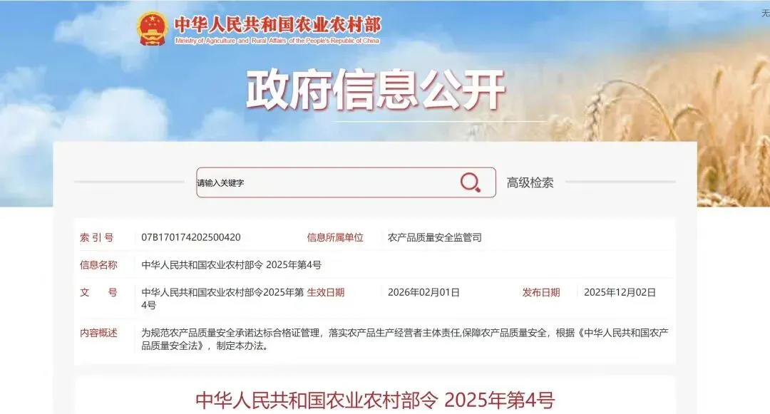 《农产品质量安全承诺达标合格证管理办法》已经农业农村部2025年11月21日第12次常务会议审议通过,现予公布,自2026年2月1日起施行。