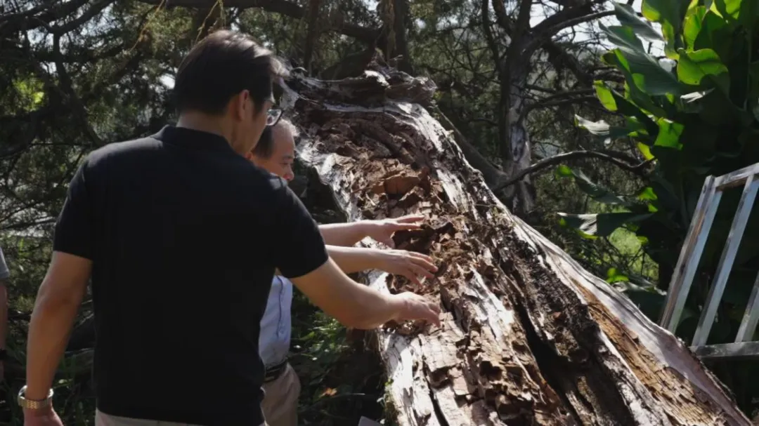 圆柏修复现场勘察,人员细查枯干腐损