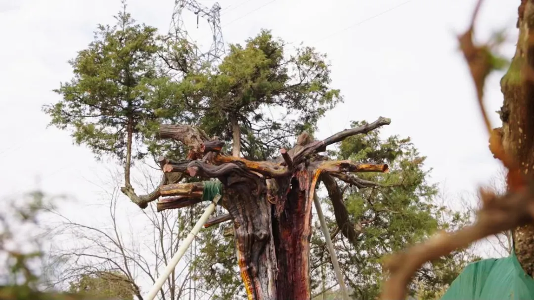 圆柏修复后:树洞防腐、枯枝清理、围栏护守、倒伏支撑