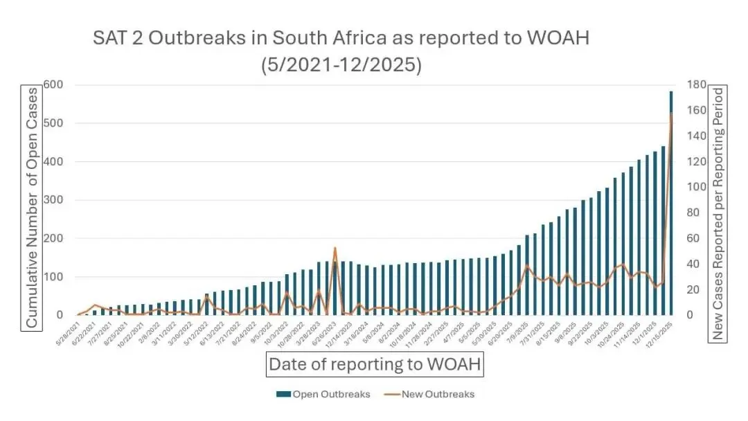 图表显示了世界动物卫生组织(WOAH)报告的南部非洲地区(SAT)2型口蹄疫病毒的未结病例数。