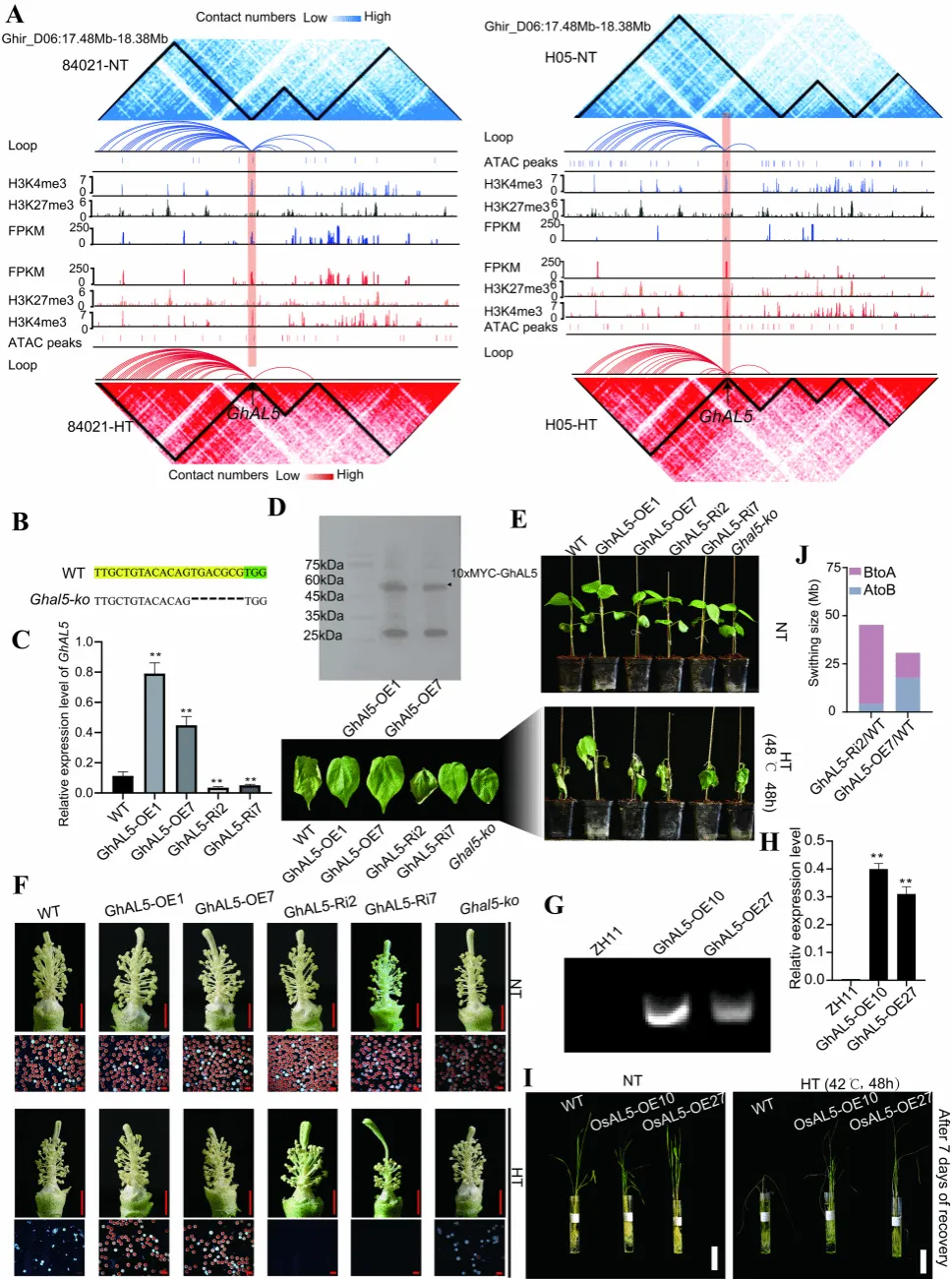 近日,华中农业大学作物遗传改良全国重点实验室闵玲教授团队在Advanced Science期刊上发表题为“Chromatin topology reconfiguration orchestrates thermotolerant male fertility via GhAL5 in cotton”的研究成果。华中农业大学作物遗传改良全国重点实验室已出站博士后李焱龙(现就职湖南农业大学)为第一作者、新疆农业科学院棉花所杨静助理研究员与王为然副研究员(均为华中农业大学在读博士生)为本文共同第一作者。闵玲教授和新疆农业科学院棉花所孔杰研究员为共同通讯作者。
