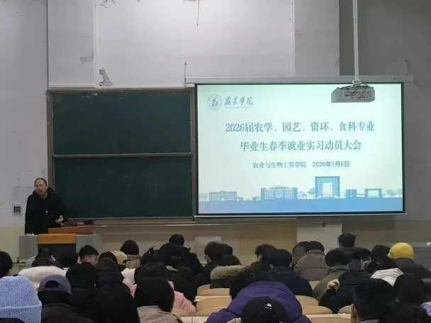 为精准锚定人才培养与行业需求的衔接点,筑牢毕业生从校园到职场的过渡桥梁,1月6日,农业与生物工程学院召开了2026届农学、园艺、农业资源与环境、食品科学与工程专业毕业生春季就业实习动员大会。学院副院长韩亚鹏主持会议,党委书记欧晓彬出席,210名相关专业毕业生、毕业班班主任及各专业系主任参会。