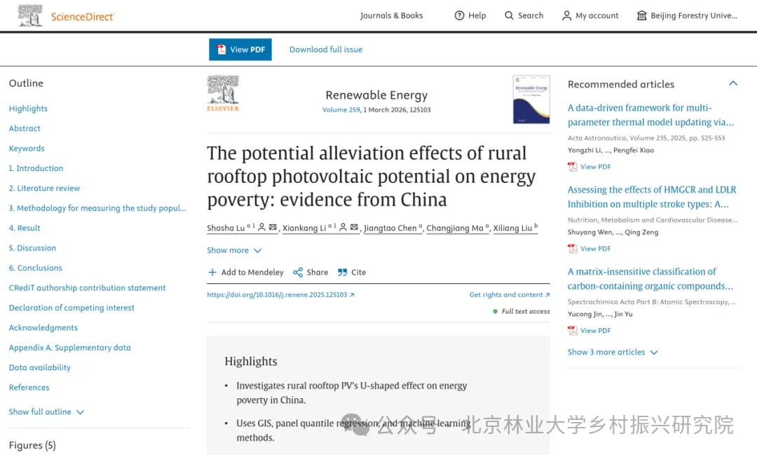 近日,我院鲁莎莎教授团队最新研究成果在能源领域国际顶级期刊《Renewable Energy》(中科院一区TOP)上正式发表,论文题为《The potential alleviation effects of rural rooftop photovoltaic potential on energy poverty: evidence from China》。鲁莎莎教授、博士生李现康为本论文的共同通讯作者、共同第一作者,其他作者分别为我院博士生陈江涛、硕士生马长江、北京工业大学刘希亮教授。该研究整合GIS、面板分位数回归与机器学习等方法,系统评估了中国农村屋顶光伏对能源贫困的“U”型影响及其显著的地区差异。研究发现,在东部地区,光伏部署能显著缓解能源贫困,而在西部受环境与政策制约,效果则相反。机制分析表明,光伏应用通过影响家庭收入与用电模式,长期提升了能源可负担性。研究预测,持续的光伏部署有望在2030年前将农村能源贫困差距缩小50%以上。该成果为优化我国光伏扶贫政策、推动能源公平转型提供了重要的科学依据与决策参考。