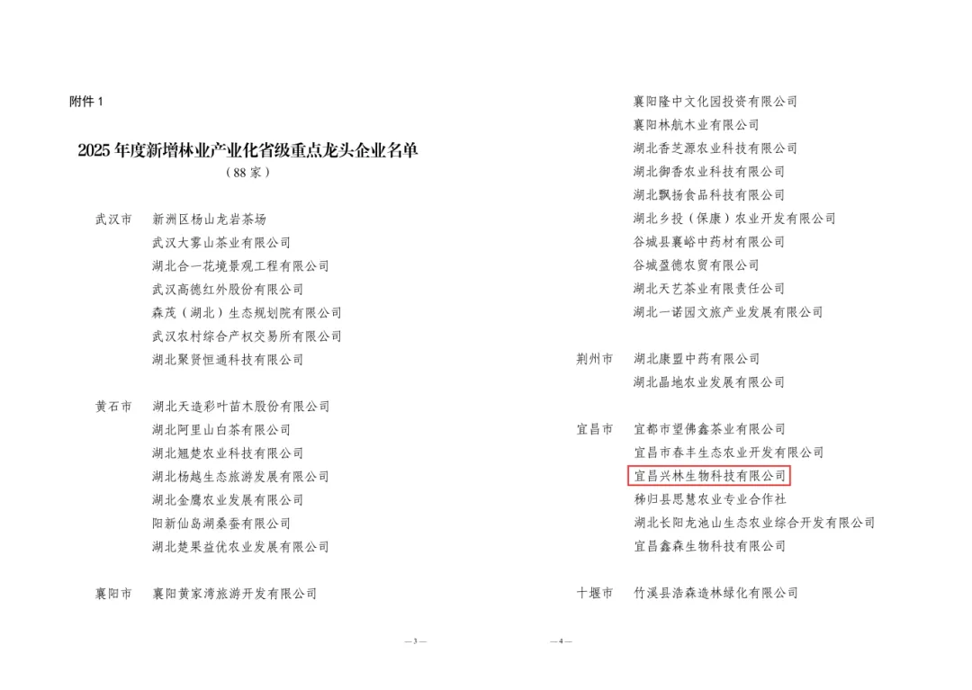 近日,湖北省林业局公布了2025年度省级林业产业化重点龙头企业名单,宜昌兴林生物科技有限公司凭借在林业领域的卓越贡献与突出实力,荣耀上榜!这一殊荣不仅是对兴林公司多年来深耕林业产业的高度认可,更是对其坚持创新发展道路的有力彰显。