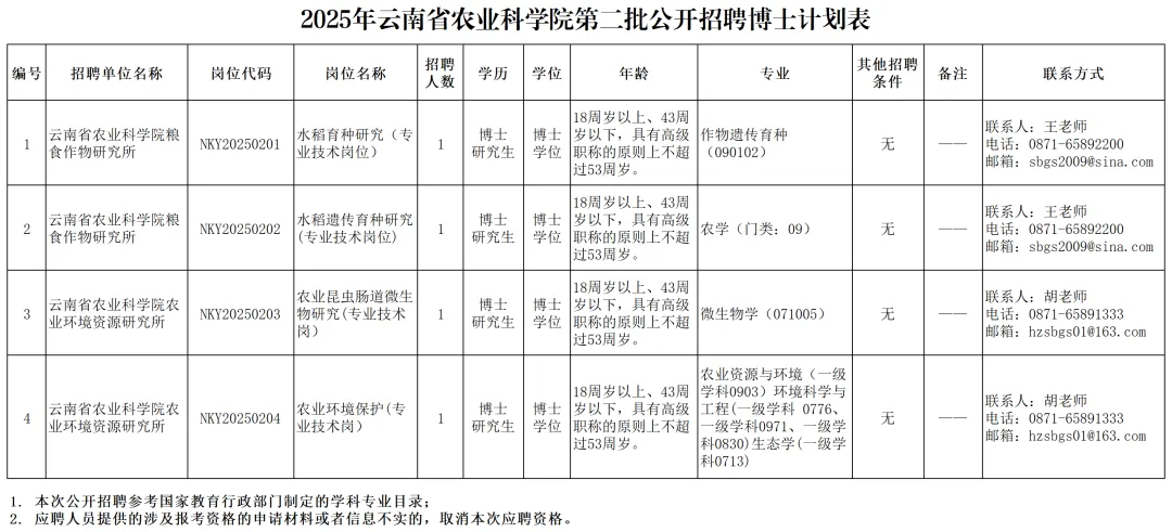 以上2家单位共公开招聘工作人员4名。具体招聘岗位及招聘条件,详见《2025年云南省农业科学院第二批公开招聘博士计划表》(附件1)。