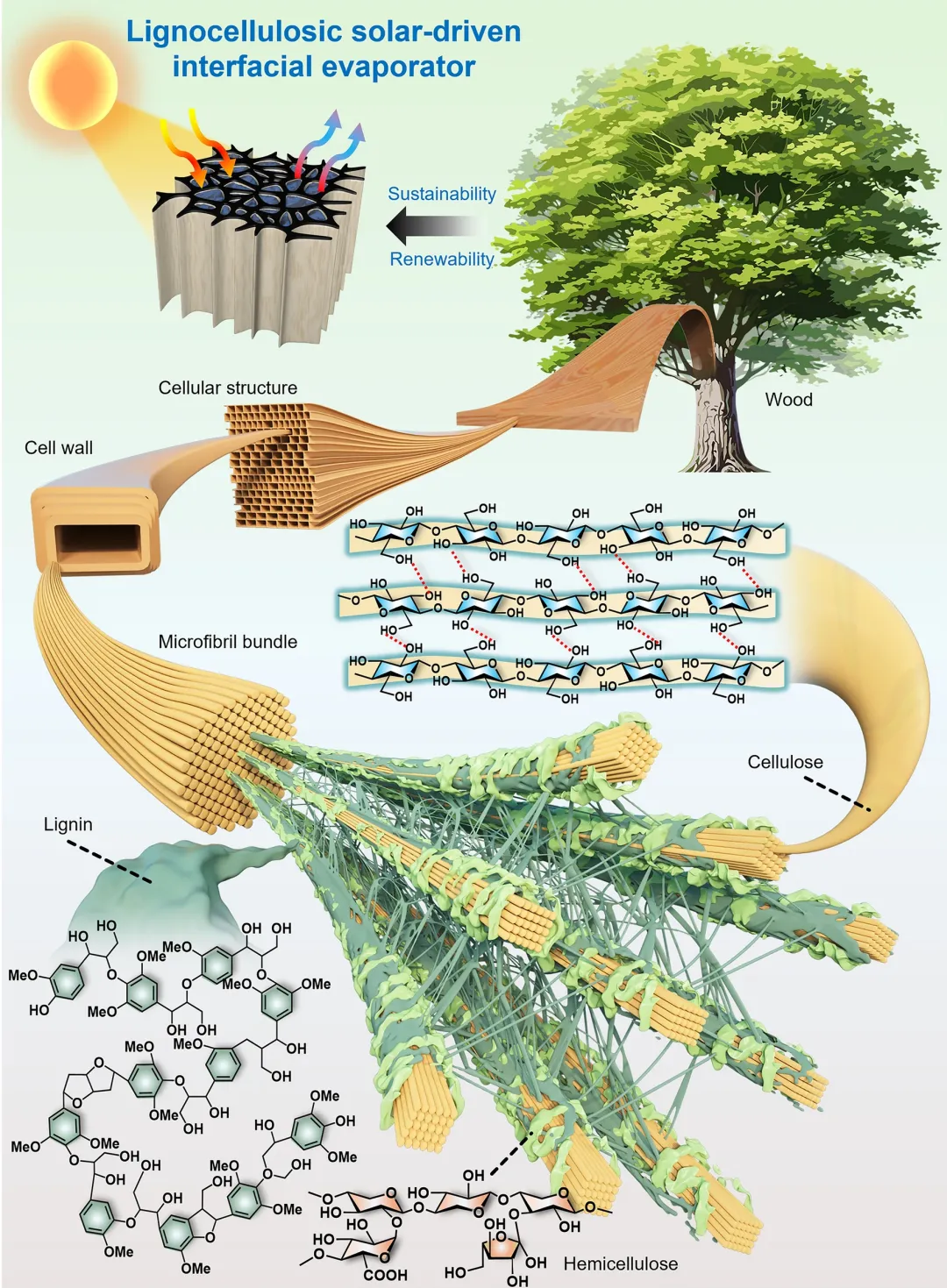 淡水资源日益紧缺,推动着以太阳能驱动的界面蒸发器迅速发展,成为利用太阳能获取淡水的一种可持续技术路径。木质纤维素生物质因其来源广泛、可再生性强、具有独特的天然多级结构以及优于合成聚合物的生物降解性,被认为是构建太阳能蒸汽发生器的理想材料。本综述旨在系统阐述如何基于可再生木质纤维素生物质,设计并优化高性能一体化太阳能界面蒸发器,并提供创新而深入的观点。首先,简要介绍了木质纤维素生物质的结构特性,阐明其作为光热层或支撑基底在蒸发器中的适用性。其次,从光热层与支撑基底两个方面,综述了木质纤维素生物质基蒸发器的制备方法与加工技术。接着,重点归纳了提升蒸发效率的最新调控与优化策略。此外,本文进一步总结了该类型蒸发器在海水淡化、发电、废水处理、抗菌、大气水收集及光催化制氢等多功能应用方面的进展。最后,对当前领域面临的挑战进行了探讨,并对未来发展前景作出展望,以期为木质纤维素生物质基太阳能界面蒸发器的进一步研究与开发提供新的思路。相关成果以“Engineering Renewable Lignocellulosic Biomass as Sustainable Solar‑Driven Interfacial Evaporators”为题,发表在Nano-Micro Letters上。