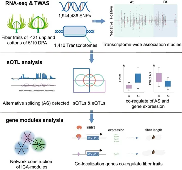 近日,我院李付广研究员团队首次在群体水平利用多组学方法,阐明了转录与转录后可变剪接影响棉花纤维伸长的遗传机制,为棉花分子育种与性状改良提供了新思路和基因资源。相关研究成果以“Independent component analysis deciphers the genetic basis of cotton fiber elongation through eQTLs and sQTLs”为题发表在国际著名期刊《高级研究(Journal of Advanced Research)》上。