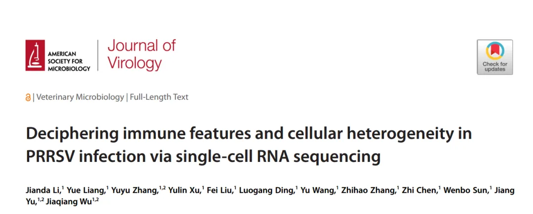 IF:4.17 中科院2区 | JCR/Q2 病毒学 参考译文:通过单细胞RNA测序解读PRRSV感染的免疫特征和细胞异质性 第一作者:Jianda Li 通讯作者:Jiang Yu, Jiaqiang Wu |