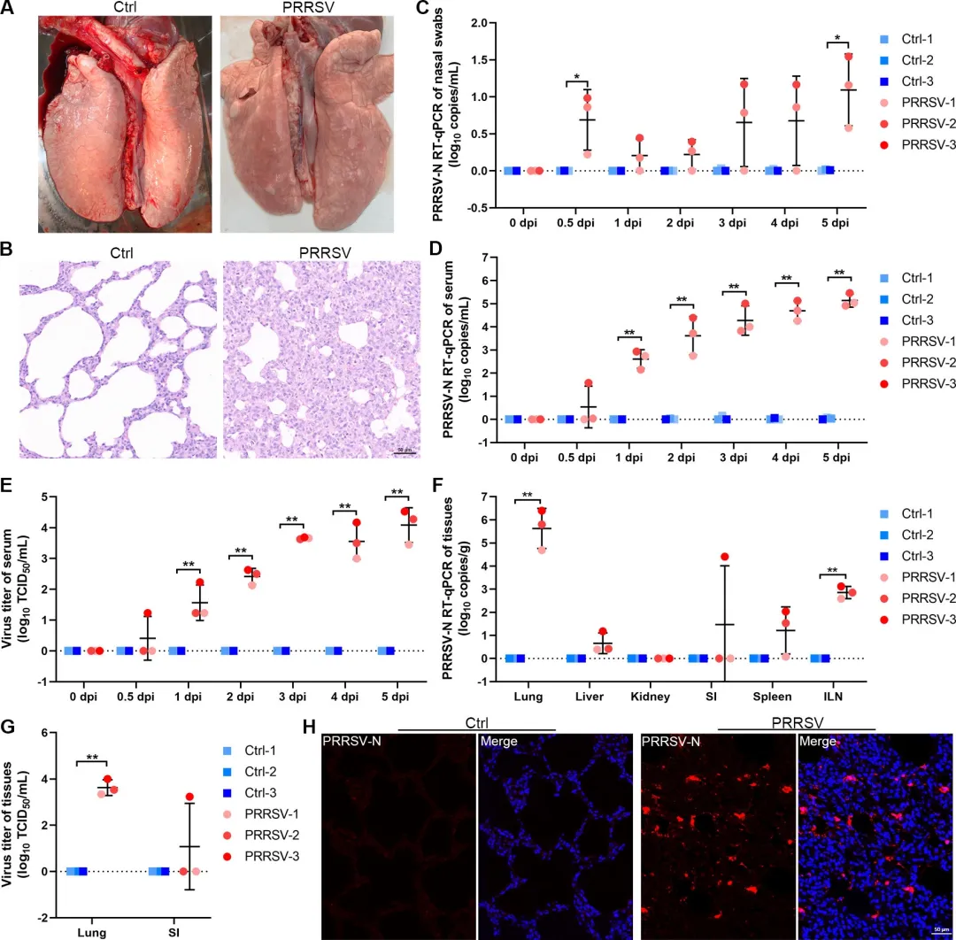 在PRRSV感染后5天内,研究团队系统追踪了病毒在仔猪体内的分布与载量动态。鼻内攻毒后0.5天即可在鼻拭子中检出少量病毒RNA,但直至4天方出现显著上升;血清中感染性病毒粒子则1天即被检出并持续升高。肺组织病毒载量最高,腹股沟淋巴结次之;意外的是,其中1头仔猪小肠亦检出高滴度病毒,提示PRRSV早期即可突破呼吸道屏障向肠道扩散。免疫荧光证实病毒主要聚集在肺泡及肺泡隔,与组织贫血、间质增厚和大量淋巴细胞浸润同步。