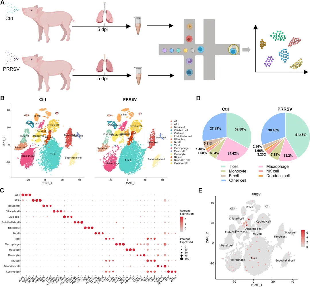 图1.猪繁殖与呼吸综合征病毒感染后病毒载量及在仔猪多器官中的分布2.PRRSV感染后肺内细胞类型组成和病毒分布的单细胞分析对感染后5天的仔猪肺组织进行单细胞RNA测序,共捕获46,922个高质量细胞,整合对照与PRRSV组后聚为15个主要类型。病毒感染显著重塑细胞比例:巨噬细胞占比由2.86%骤降至1.48%,而T细胞由6.54%升至13.2%。病毒转录本主要分布于巨噬细胞(约占全部细胞的2%),且高度富集于SPP1^high亚群;其余上皮、内皮及免疫细胞几乎未检出病毒RNA,提示PRRSV早期靶向极窄。图2.PRRSV感染肺中细胞簇的鉴定