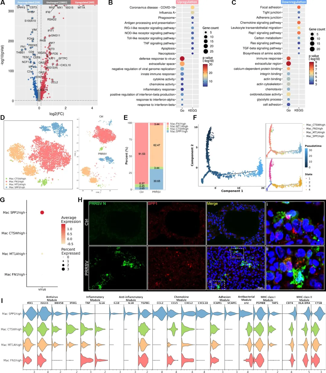PRRSV感染后,肺脏巨噬细胞群落发生显著重塑。单细胞转录组将其细分为FN1^high、MT1A^high、CTSW^high与SPP1^high四个亚群,其中稳态下占90%的FN1^high巨噬细胞在感染后锐减,而MT1A^high与SPP1^high亚群比例显著上升。拟时序分析显示病毒驱动FN1^high向MT1A^high及SPP1^high方向异常分化。病毒RNA几乎仅富集于SPP1^high巨噬细胞,其抗病毒、抗炎及抗原呈递信号最强,提示该亚群既是病毒主要“庇护所”,也是免疫调控中枢。
