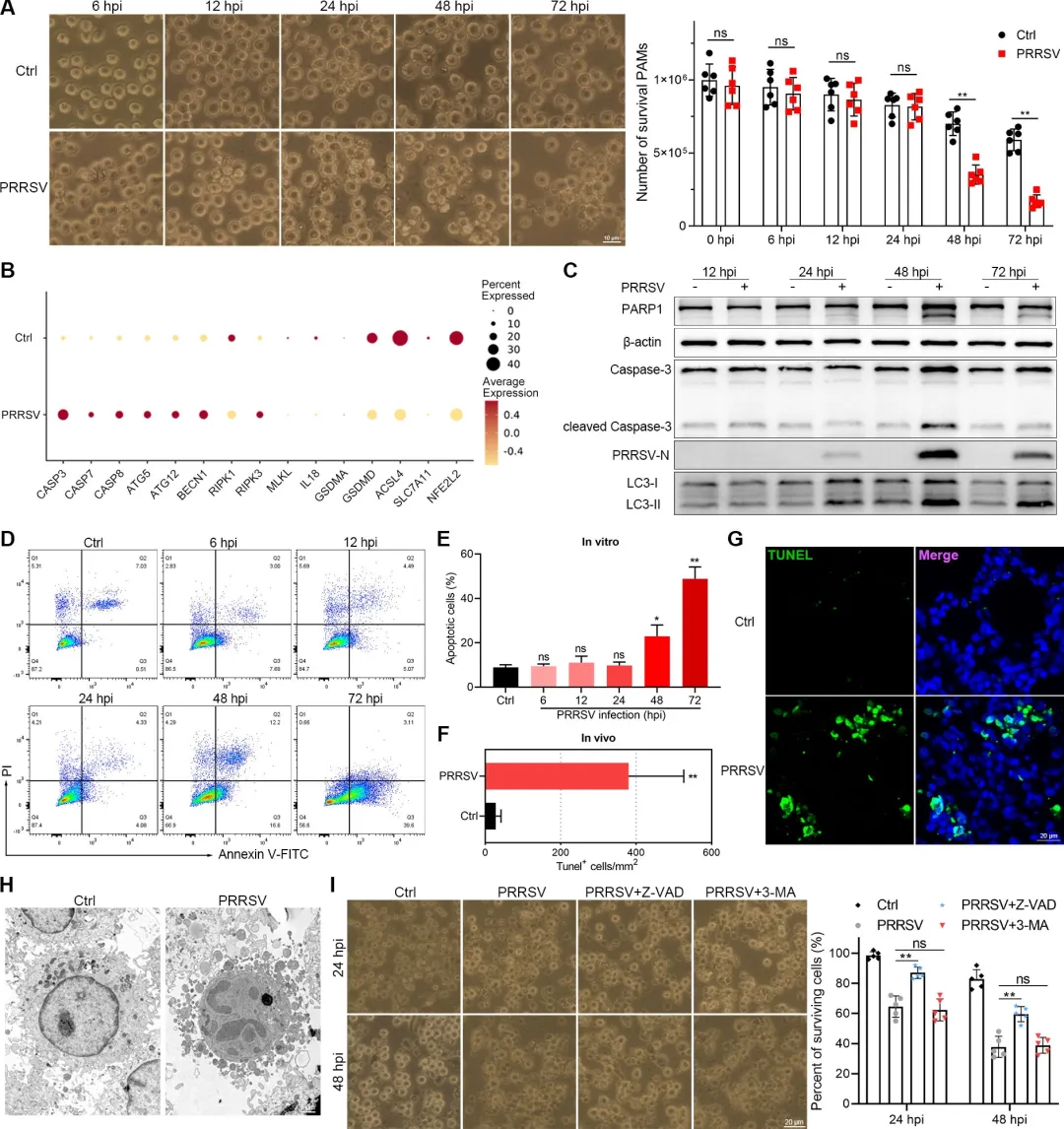 体内外实验共同证实,PRRSV通过诱导细胞凋亡而非自噬、焦亡或铁死亡造成巨噬细胞大量耗损。感染48 h内,肺泡灌洗液及肺切片中可见大量TUNEL阳性巨噬细胞;Marc-145与PAMs模型显示,病毒显著上调CASP3/7/8、PARP1剪切及LC3-II转化,Z-VAD-FMK凋亡抑制剂可挽救>60%细胞存活并降低病毒滴度,而3-MA自噬抑制剂仅抑制病毒复制却无减死效果。
