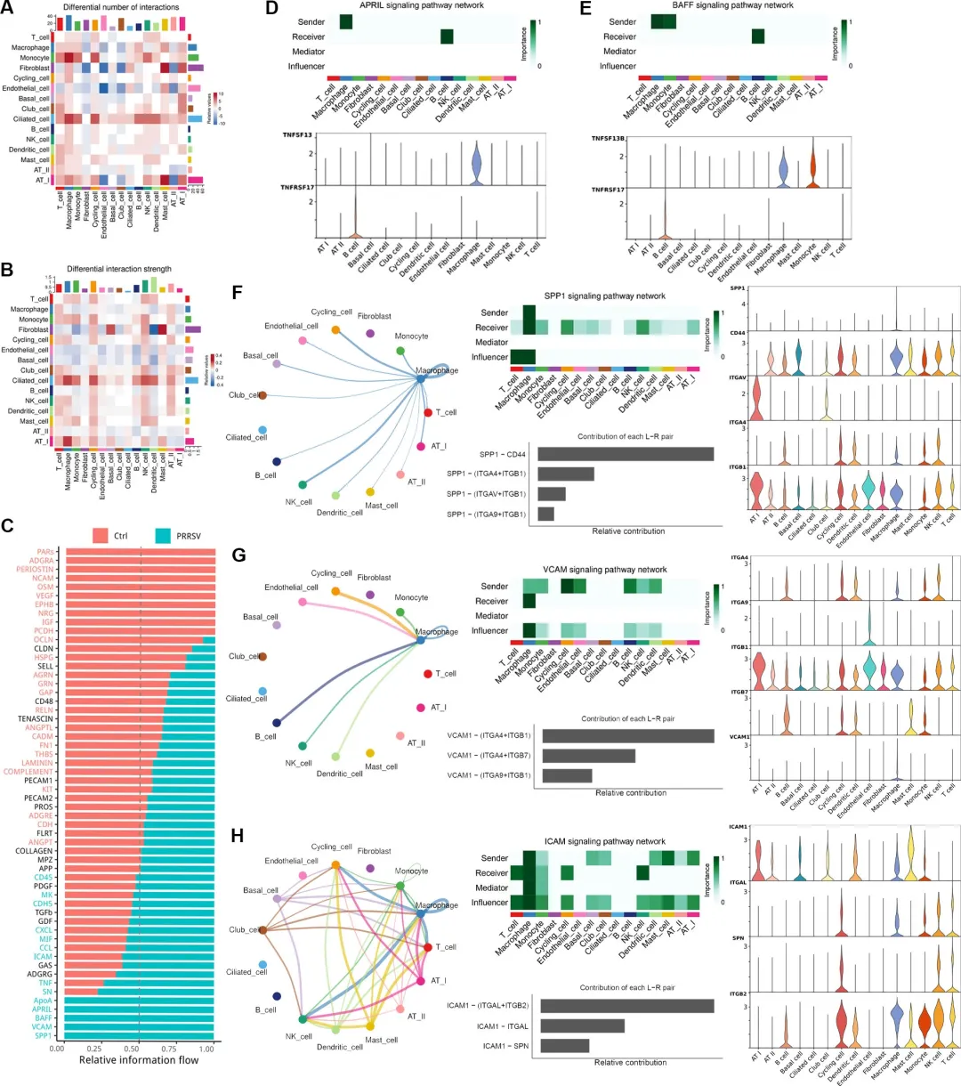 CellChat分析显示,PRRSV感染使肺内细胞间通讯强度提升1.8倍,巨噬细胞成为信号发送与接收的核心枢纽。病毒诱导巨噬细胞高表达SPP1、ICAM1、VCAM1及TNF,通过CD44、整合素和TNFRSF轴与上皮、内皮、T/B细胞、单核细胞建立异常连接;其中SPP1-CD44通路占据信息流量首位,驱动炎症与纤维化相关基因表达。同时,巨噬细胞分泌APRIL/BAFF激活B细胞TNFRSF17,却未能诱导高亲和力抗体应答。