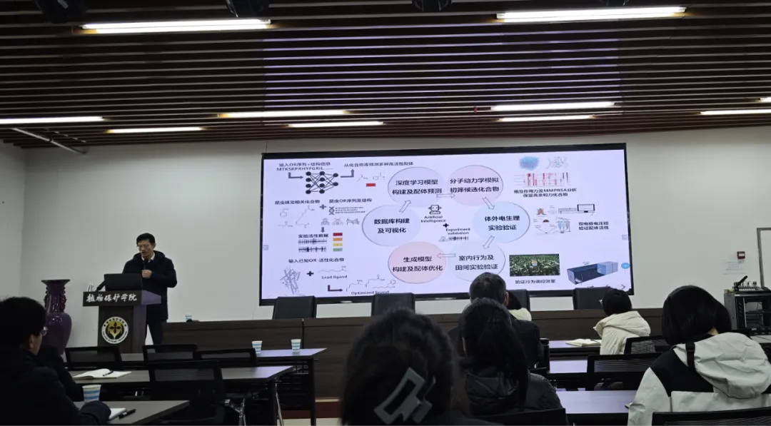 报告会上,王桂荣研究员系统梳理了其课题组近年来在重大农业害虫嗅觉识别分子机制领域取得的系列突破性进展。该团队整合基因组学、结构生物学、化学生态学等多学科技术手段,精准解析了棉铃虫、草地贪夜蛾、东方黏虫、蚜虫等典型农业害虫关键嗅觉受体的结构特征与功能调控机制,并以此为理论依据,成功研发出具有高度物种特异性的昆虫行为调控剂。目前,相关核心技术已在目标害虫的田间绿色防控中完成应用示范,为减少化学农药施用、推动植物保护学科的可持续发展提供了切实可行的技术方案。 互动交流环节中,与会师生与王桂荣研究员围绕研究方向拓展、技术方法创新及超算技术在该领域的应用前景等关键问题展开深入研讨,参会人员均表示收获颇丰、启发良多。