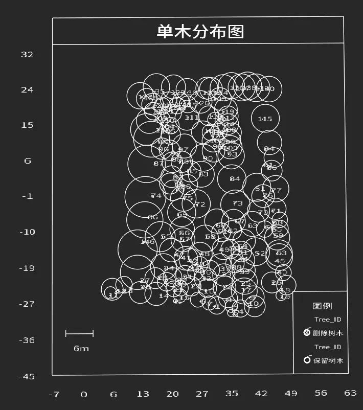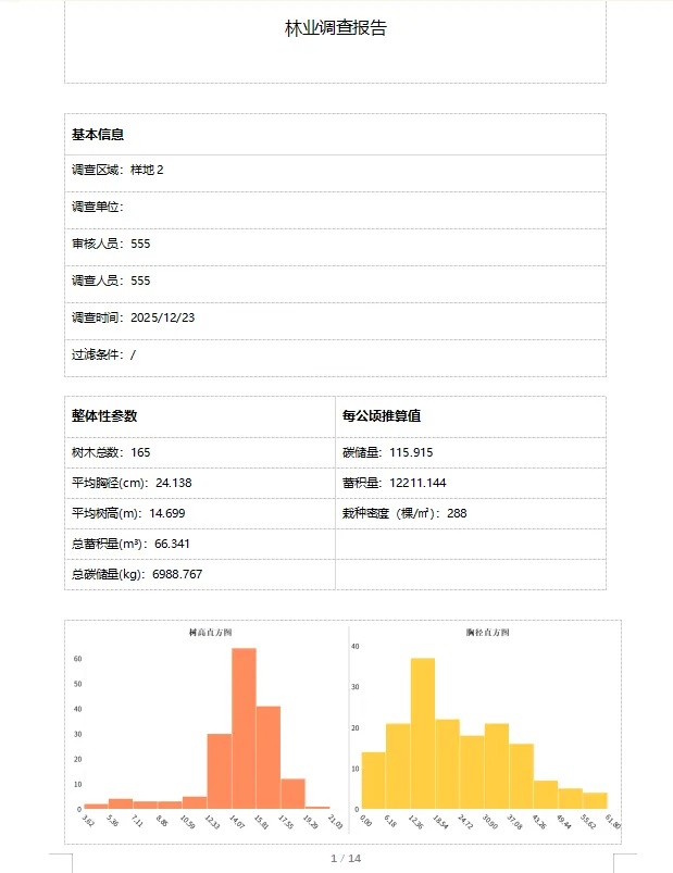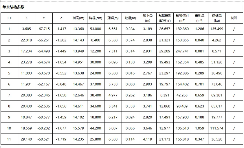 外业采集数据导入内业软件后分别进行点云构图、地面点提取、单木分割、检查与编辑、输出样地分析报告,最终可获得单木分布图、碳汇储量、树木信息等报告数据。