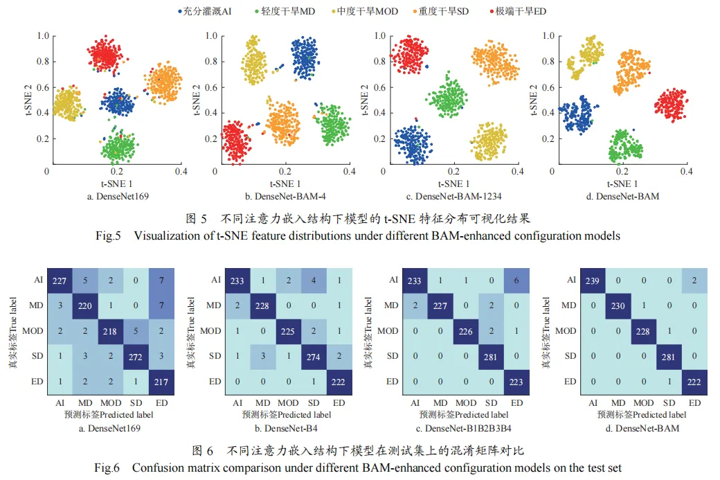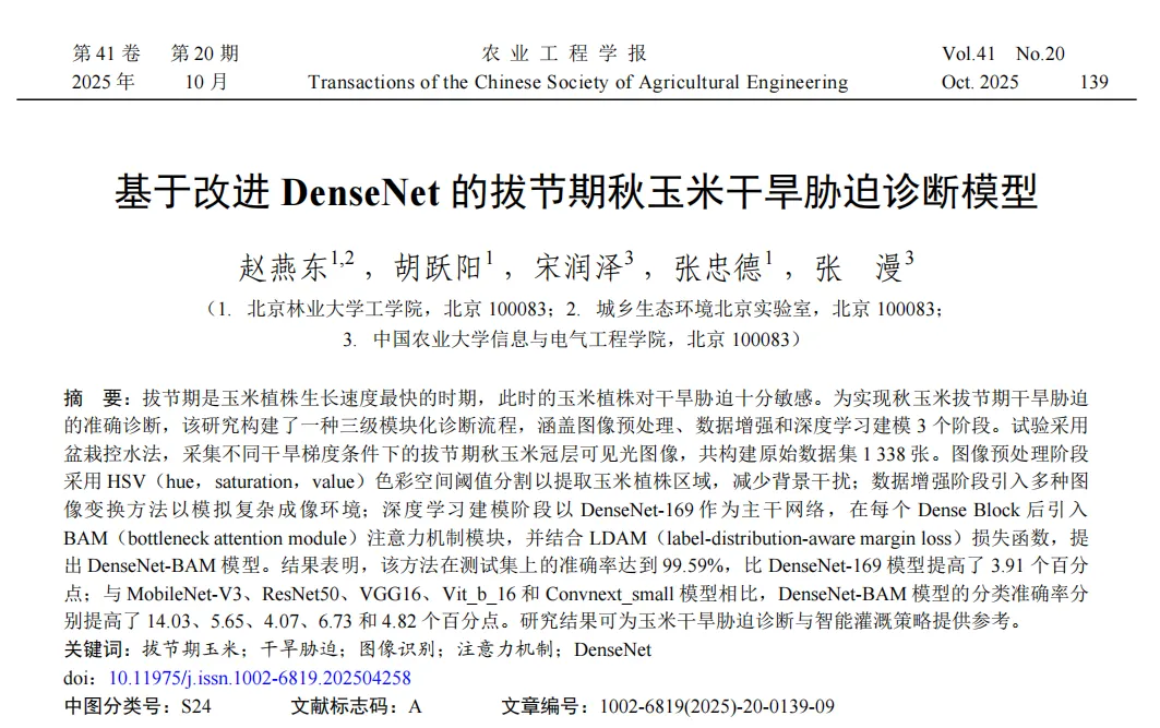 试验采用盆栽控水法,采集不同干旱梯度条件下的拔节期秋玉米冠层可见光图像,共构建原始数据集1338张。图像预处理阶段采用HSV(hue,saturation,value)色彩空间阈值分割以提取玉米植株区域,减少背景干扰;数据增强阶段引入多种图像变换方法以模拟复杂成像环境;深度学习建模阶段以DenseNet-169作为主干网络,在每个Dense Block后引入BAM(bottleneck attention module)注意力机制模块,并结合LDAM(label-distribution-aware margin loss)损失函数,提出DenseNet-BAM模型。