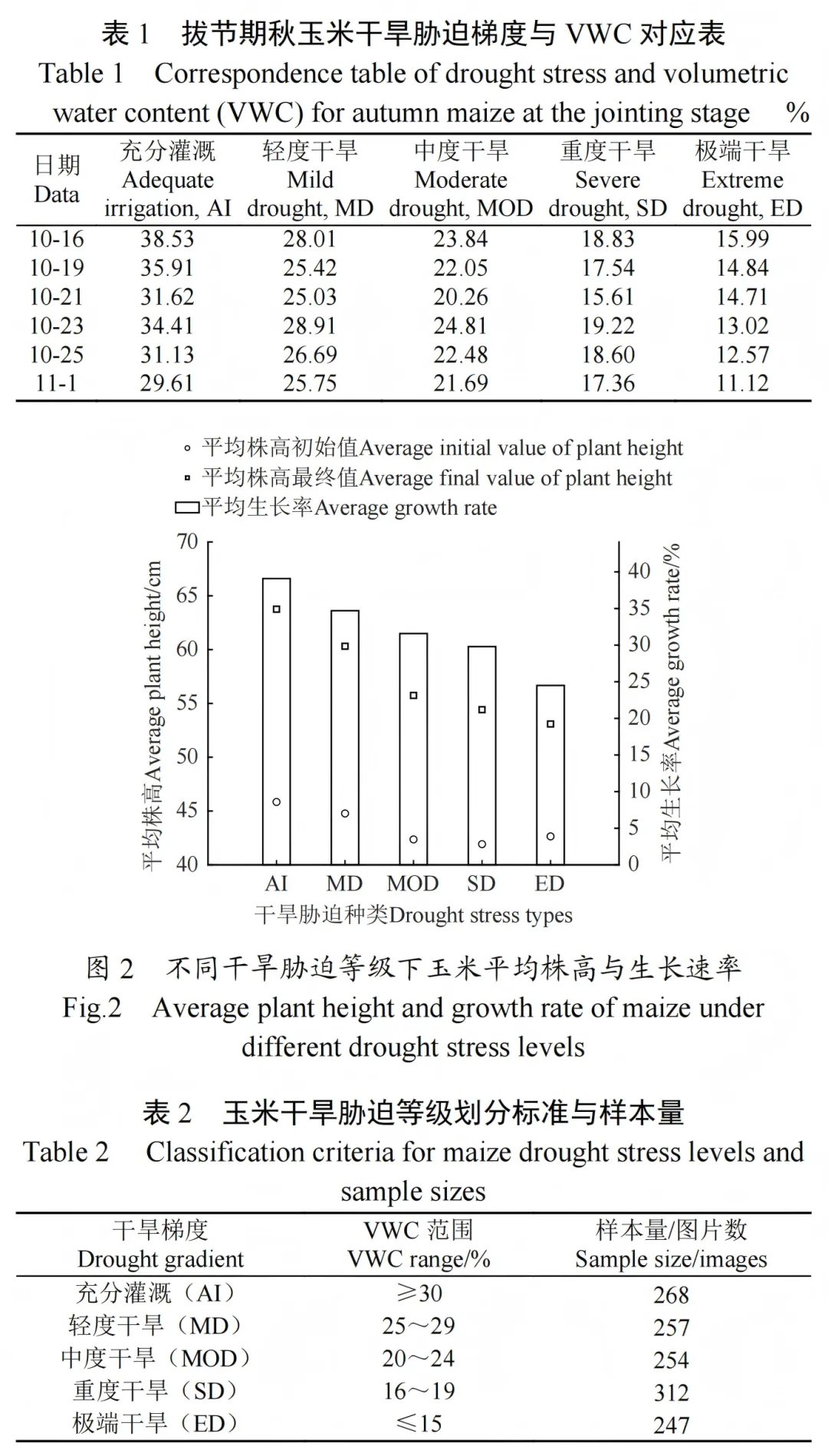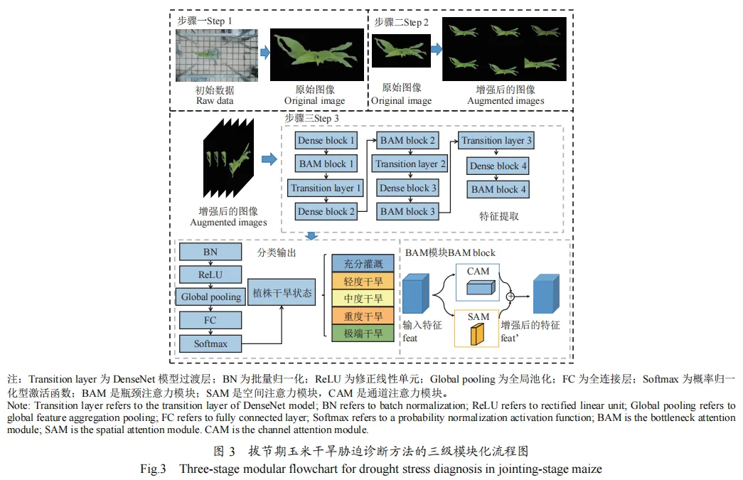 拔节期是玉米植株生长速度最快的时期,此时的玉米植株对干旱胁迫十分敏感。为实现秋玉米拔节期干旱胁迫的准确诊断,该研究构建了一种三级模块化诊断流程,涵盖图像预处理、数据增强和深度学习建模3个阶段。