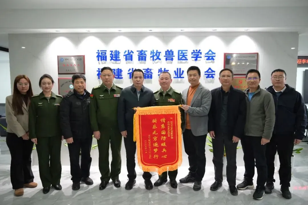 2026年1月7日,32228部队专程前往福建省畜牧兽医学会、福建省畜牧业协会,送上书有“情系国防暖兵心,骑乐无穷追梦行”字样的锦旗,对学会、协会在2025年8月联合举办的“夏日童行、骑乐无穷”雏鹰夏令营马术主题实践活动中的大力支持与辛勤付出表示衷心感谢。学会理事长梁全顺、协会会长薛永钦,学会副理事长兼支部书记林加土、副理事长黄勤楼,协会监事长康永松、秘书长兰林森,副秘书长官土根、黄稳、陈颖等共同接待并参加座谈。