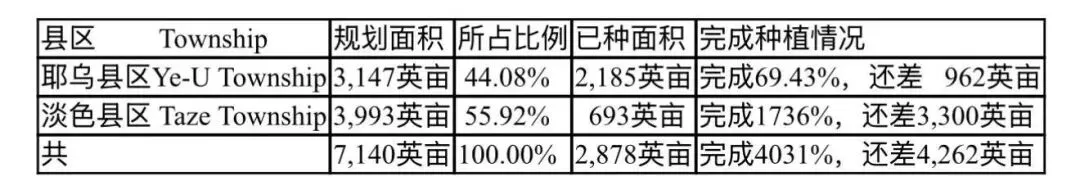 三个县区中,德拜茵(Dabayin)县区完全没规划种植此利玛豆,淡色县区规划种植面积为最多,占了全专区规划种植面积的五成五以上比例,耶乌县区规划种植的面积不到全专区规划面积的四成五比例,目前完成的种植面积则以耶乌县区为最多,完成了规划面积三分之二以上的比例。