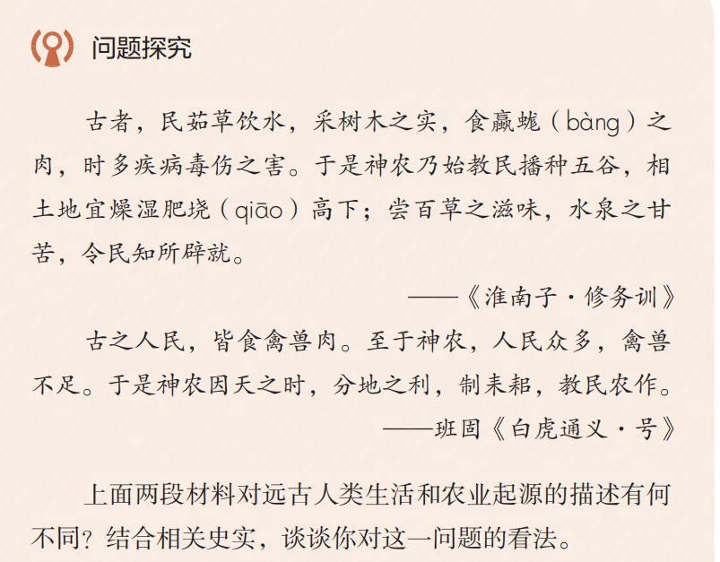 两则材料都是古人对远古人类生活和农业起源的推测,有一定道理,但不全面。古人类靠采集和渔猎获取食物,其食物来源既有植物果实、昆虫,也有禽兽。农业的起源有多种因素,除材料中的因素外,人类对植物生长发育知识的掌握是主要因素(选2P3 第1段)