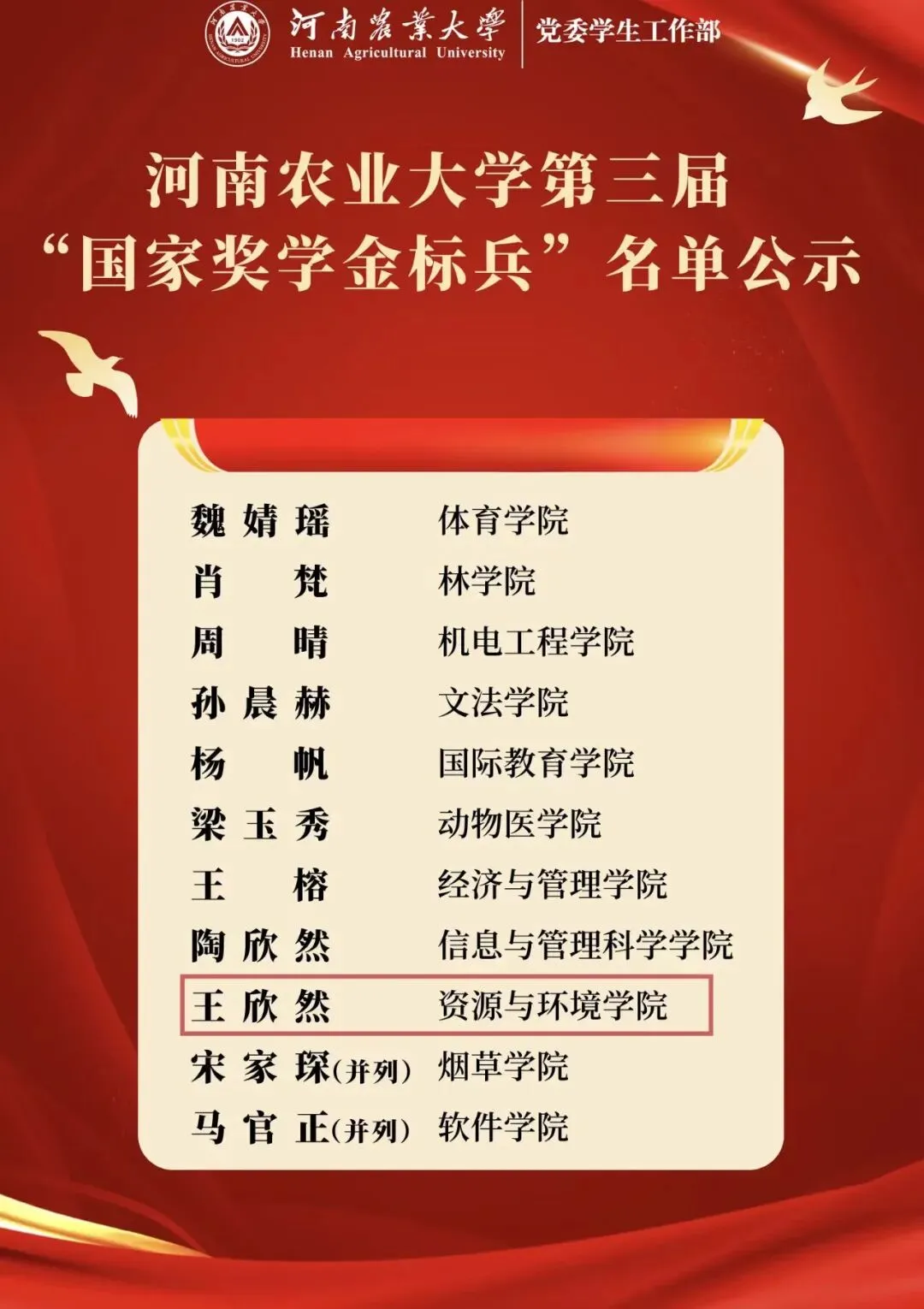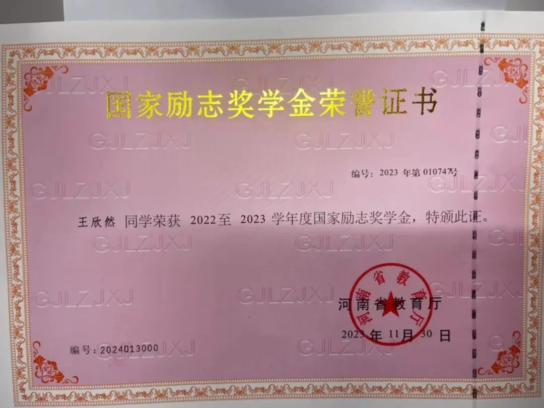 (王欣然获得国家励志奖学金)