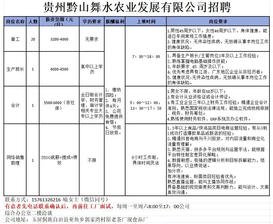 贵州黔山舞水农业发展有限公司招聘