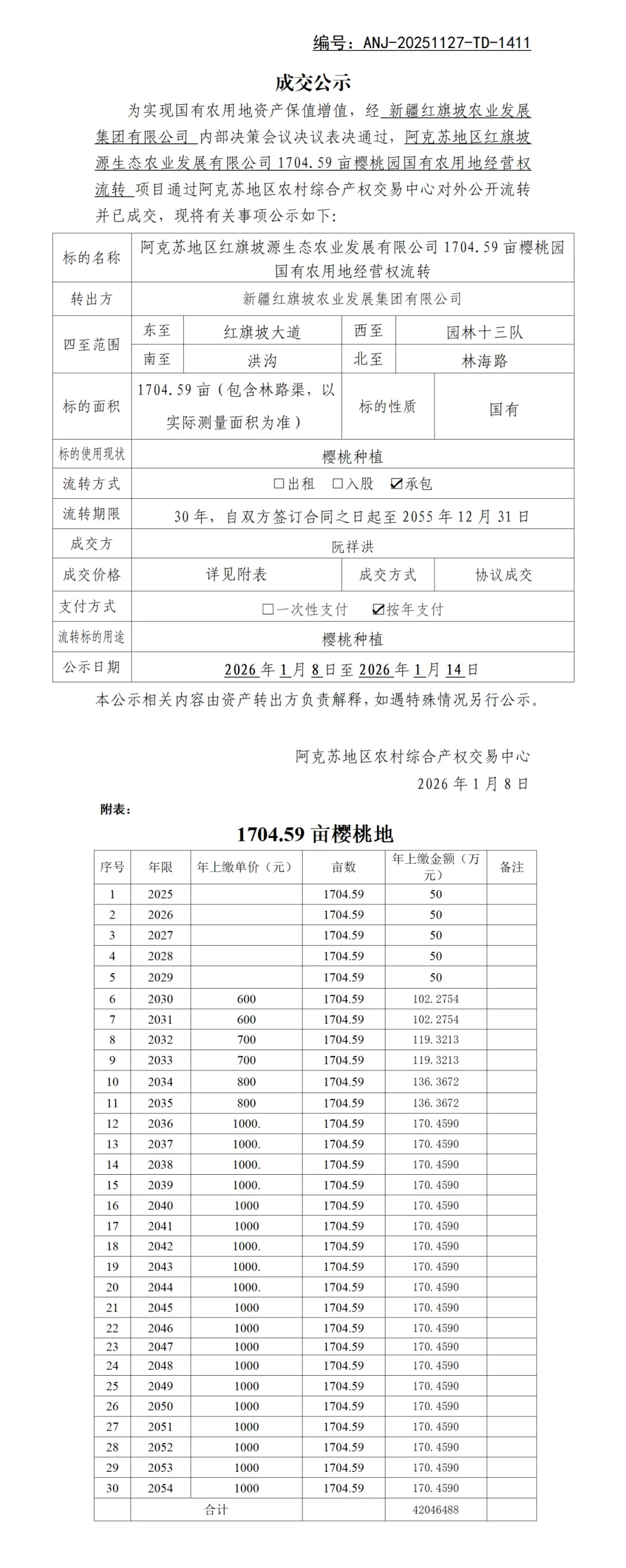 >阿克苏地区红旗坡源生态农业发展有限公司1704.59亩樱桃园国有农用地经营权流转项目成交公示