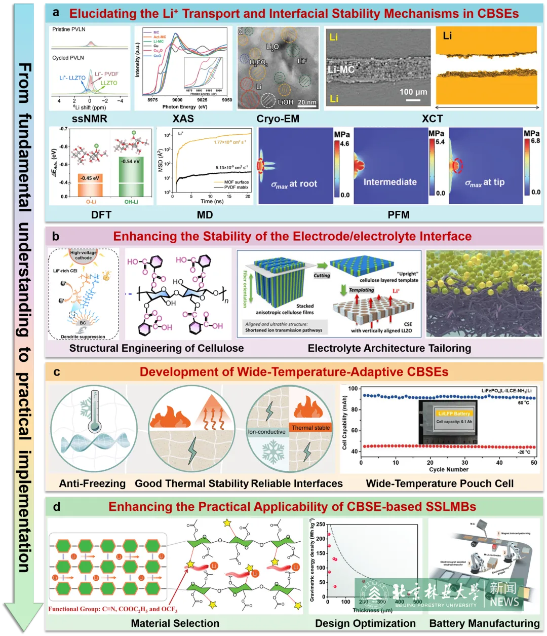 近日,北京林业大学材料学院许凤教授团队在《Advanced Energy Materials》期刊上发表题为“Cellulose-Based Solid-State Electrolytes for Solid-State Lithium Metal Batteries: Advances in Functionalization Strategies and Interfacial Engineering”的综述论文。材料学院青年教师张政为该论文第一作者/通讯作者,许凤教授为共同通讯作者。