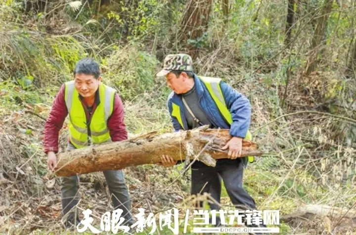 毕节市黔西市甘棠镇森林防火巡查队在毕架村林区清理枯树木。 张晶 摄