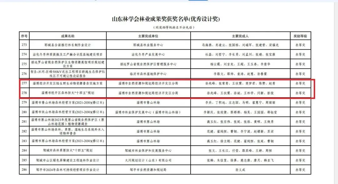 近日,由淄博市自然资源和规划局经济开发区分局组织编制、淄博市林业保护发展中心技术参与的《淄博经济开发区陆生野生动物资源普查实施方案》与《淄博经济开发区森林防火“十四五”规划(2021-2025年)》荣获“山东林学会林业成果奖(优秀设计奖)三等奖”,淄博经开区在基层自然资源精细化管理与生态安全能力建设领域再添硕果。