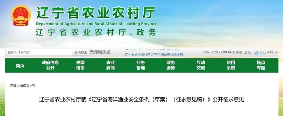 为了进一步增强立法的公开性、透明度,提高立法质量,辽宁省农业农村厅现将《辽宁省海洋渔业安全条例(草案)(征求意见稿)》全文公布,征求社会各界意见。欢迎有关单位和各界人士于2026年2月7日前,对征求意见稿提出修改意见。有关单位和各界人士的意见,可以通过信函或者电话方式,反馈到辽宁省农业农村厅。
