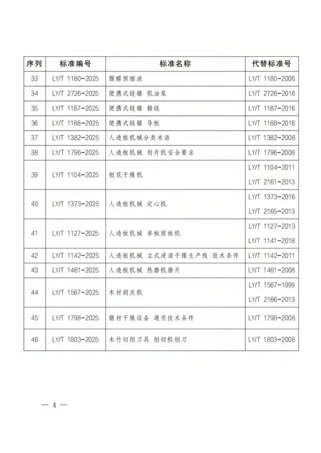 新发布的46项林业行业标准主要涉及森林草原防火、林草产业发展、林草机械装备等方面。标准内容在行业标准信息服务平台(https://hbba.sacinfo.org.cn)公开,附件所列代替标准自新标准实施之日起同时废止。