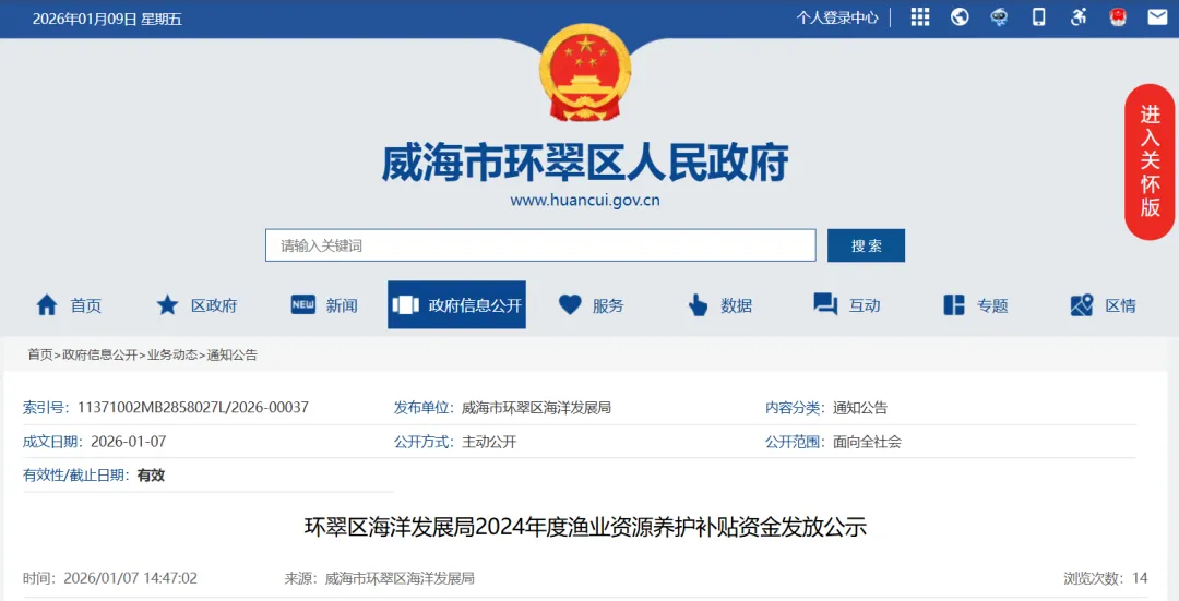 根据《山东省落实渔业发展支持政策推动渔业高质量发展实施方案》和《山东省海洋渔业资源养护补贴实施方案》要求,我区已完成2024年度渔业资源养护补贴的申报工作,并按照程序对申报补贴工作报市海洋发展局审批。根据海洋渔业资源养护补贴发放规定,现对环翠区2024年度渔业资源养护补贴进行发放公示,公示期自2026年1月8日至1月15日,公示结束无异议的,按照规定发放海洋渔业资源养护补贴。