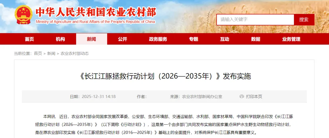 《长江江豚拯救行动计划(2026—2035年)》发布实施