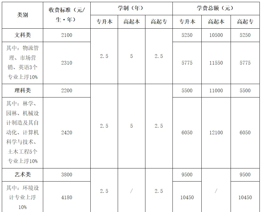 根据《关于进一步加强和规范我省高等学历继续教育收费管理的通知》(湘教发[2023]6号)要求,学生学费按学年收取,由学生本人全额上缴学校。经湖南省教育厅、湖南省发展和改革委员会、湖南省财政厅批准,中南林业科技大学高等学历继续教育林学等9个国家级一流专业自2025级起学费标准上浮10%。学费标准如下: