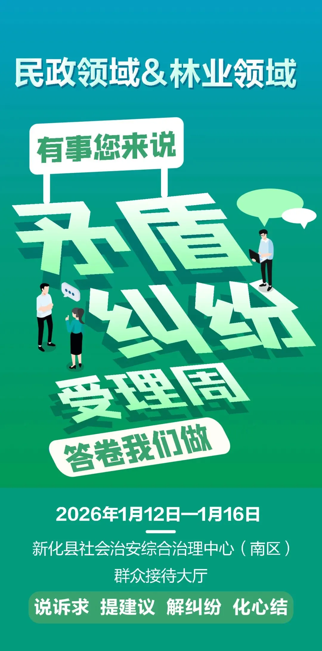 为创新推进综治中心规范化建设和实体化运行,方便群众反映诉求和政策咨询。根据新化县社会治安综合治理中心建立职能部门矛盾纠纷受理周制度,2026年1月12日—1月16日,由县民政局、县林业局受理本行业本领域矛盾纠纷和其他诉求事项。届时,欢迎广大群众来新化县社会治安综合治理中心(南区)群众接待大厅反映相关矛盾纠纷诉求、意见、建议和需要解决的问题。