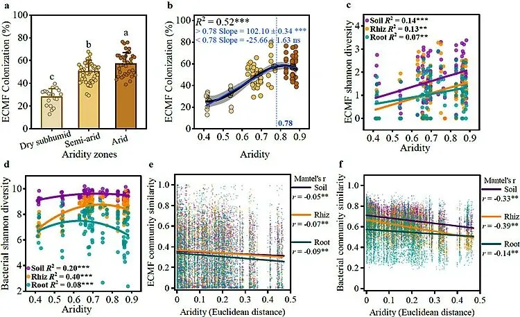 该成果深化了“植物-菌根真菌-细菌”跨界互作的生态理论认识,为基于合成生物学的菌根接种剂研发提供了科学依据,对提升干旱区人工造林效率,推动全球干旱、半干旱区生态治理具有重要实践价值。